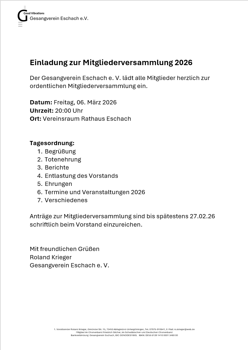 Der Gesangverein Eschach e.V. steht seit seiner Gründung für gelebte Gemeinschaft, musikalische Vielfalt und ehrenamtliches Engagement.